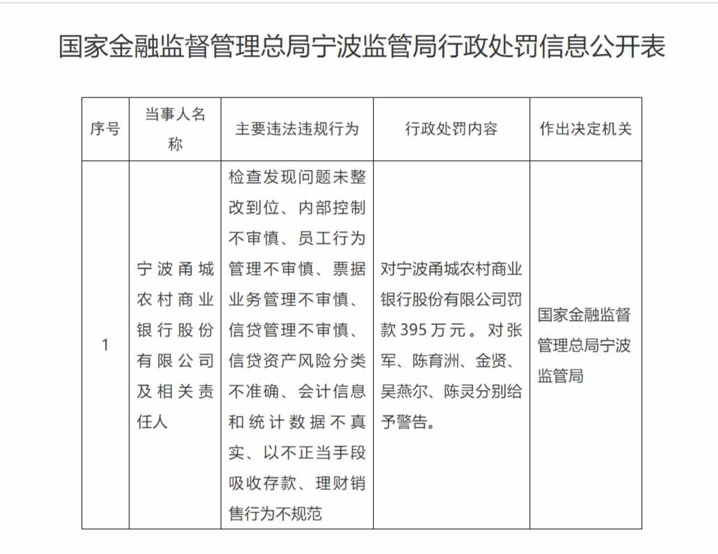 12月26日,国家金融监督管理总局宁波监管局行政处罚信息公开表显示股配咖吧,宁波甬城农村商业银行股份有限公司,检查发现问题未整改到位、内部控制不审慎、员工行为管理不审慎、票据业务管理不审慎、信贷管理不审慎、信贷资产风险分类不准确、会计信息和统计数据不真实、以不正当手段吸收存款、理财销售行为不规范,被罚款395万元。