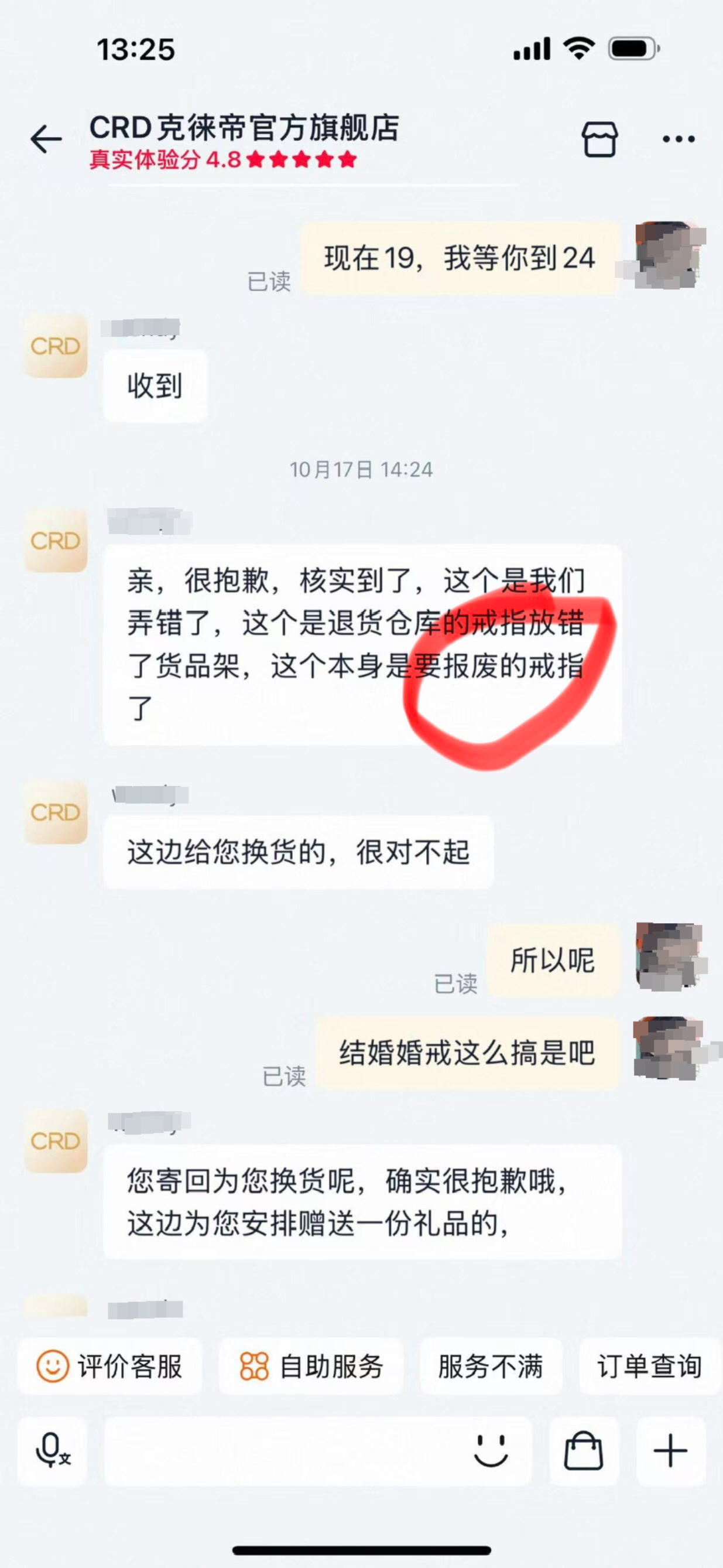 项先生提供的聊天记录截图显示,客服表示这枚戒指是报废的戒指,因工作人员失误,放错货架,导致寄给了项先生,并表示可以为项先生换货,并赠送一份礼品。